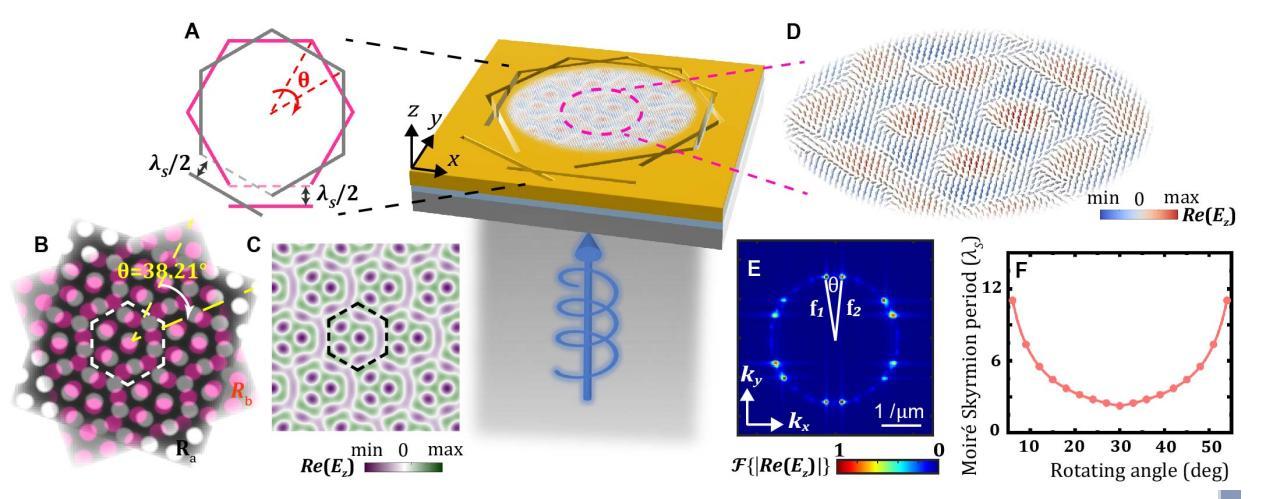 团队研究人员在金薄膜表面蚀刻出两组相对扭转的六边形纳米狭缝结构,用以激发表面等离激元并实现其干涉叠加,研究发现金属表面存在由多个光学斯格明子嵌套形成的大型光学斯格明子簇。这种莫尔结构为电子体系中的物理现象提供了一种光学类比平台。更为重要的是,扭转角可以作为微纳尺度光场调控的可编程旋钮。这些斯格明子簇的拓扑数对该扭曲复合结构的纳米级位移做出灵敏响应,相应的拓扑转变为复合纳米结构之间的对准提供了精确的计量信标。下一步将在现有基础上,瞄准半导体制造量测的“卡脖子”痛点,致力于突破亚波长光学测量精度极限。